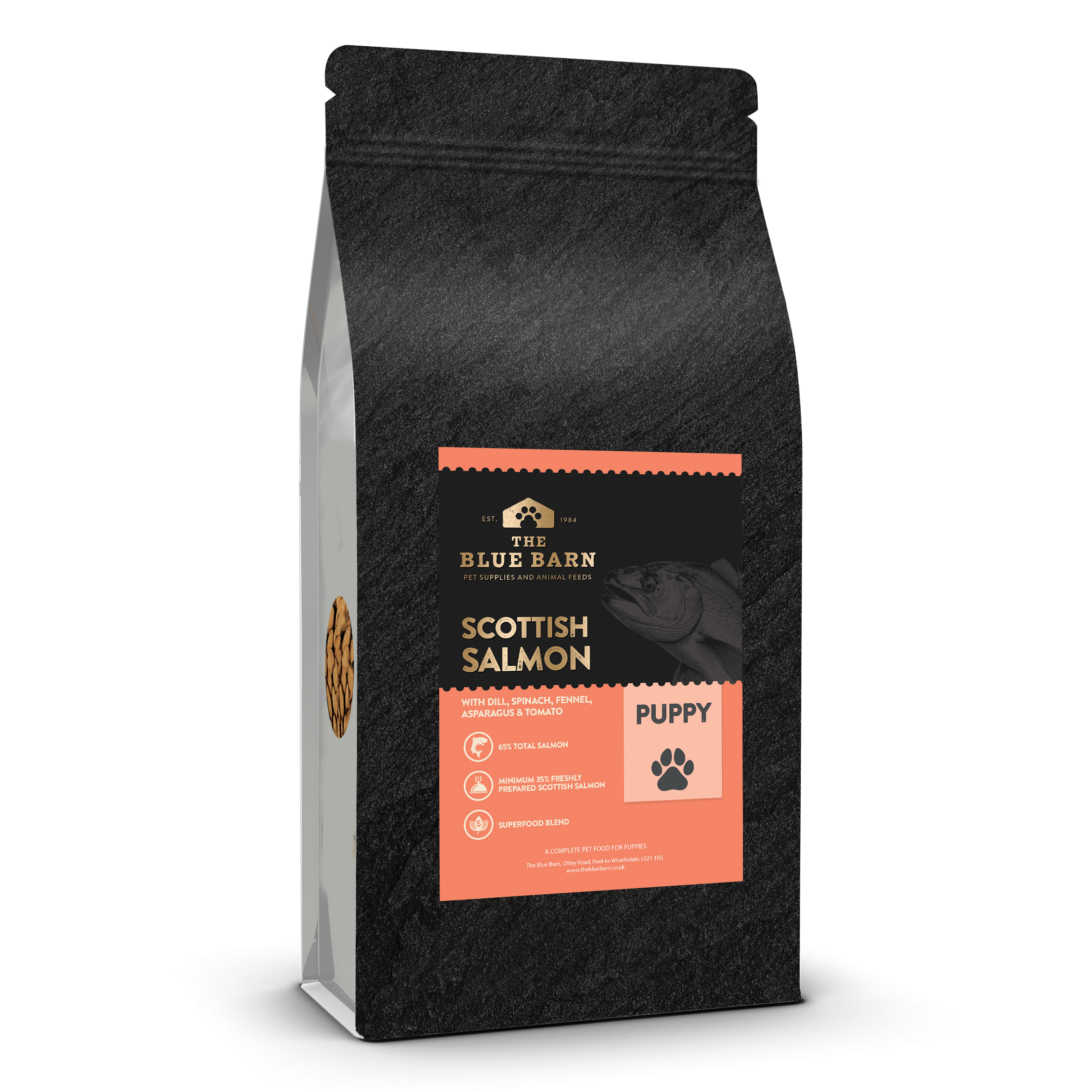 The Superfood 65 range incorporates 65% meat in all the recipes, alongside fresh vegetables, botanicals and a unique blend of superfoods, each with their own health benefits. The Superfood 65 range is fantastic for those with dietary sensitivities to grains as all the recipes are grain free. The Scottish Salmon Puppy recipe is formulated with 65% responsibly sourced salmon, which has been gently cooked to preserve the essential amino acids, vitamins and minerals that are present. This recipe is rich in naturally occurring collagen, found in freshly prepared meat, which contributes to healthy joints and skin. The Puppy recipe has extra protein to support growth and development in young dogs, and is rich in the nutrients required for them to thrive. The superfood blend included in the Scottish Salmon recipe includes:
