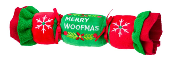 House of Paws Christmas Cracker Dog Toy! Shaped like a traditional Christmas cracker and featuring vibrant green and red colours, complete with a built-in squeaker. Whether as a stocking filler or a festive treat, this delightful dog toy is sure to make tails wag this Christmas! This toy is for use by pets only. Always supervise your dog during playtime and remember to remove toys if damage occurs or any parts become detached.